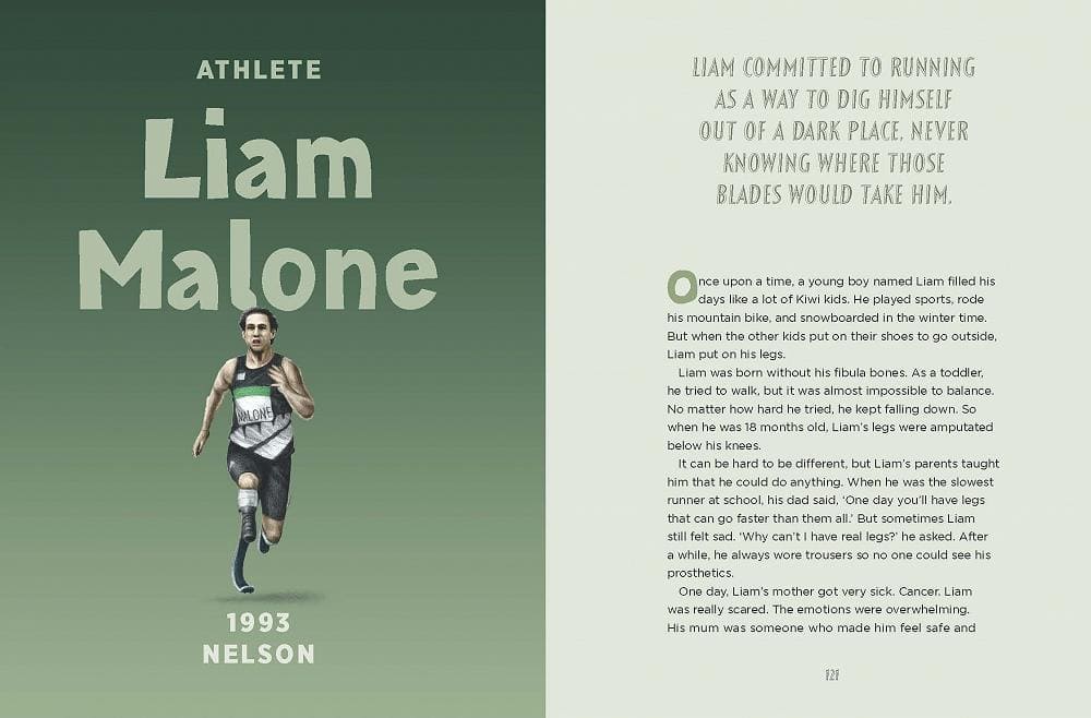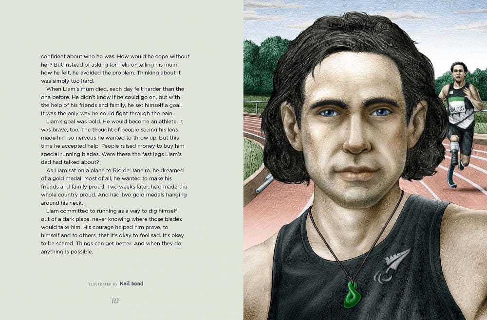 Liam Malone’s story – accompanied by illustrations by Neil Bond – was one of the first that Stuart Lipshaw wrote. “The Paralympics were still fresh in my mind. He was someone who I though just had such a positive outlook. Then when I learnt more about his story and quite recently he’s been talking about all the anxiety and stuff he had – it’s so important to be talking about those sorts of things. I really wanted to get someone who had that message into the book. He’s pretty inspiring.”