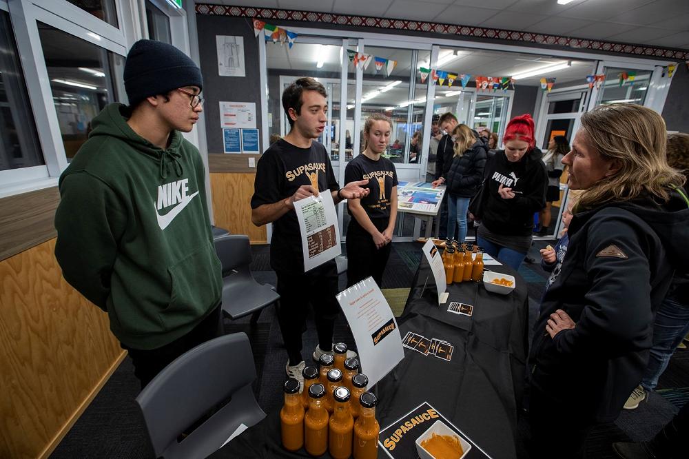 Opening sales figures are looking promising for ‘Supa Sauce’ as members of the public who toured Nayland College’s Open Evening on Tuesday got to sample and purchase the group’s delicious product. Supa Sauce, alongside ‘Doctor Herb’ and ‘ATYR’ are participating in The Lion Foundation Young Enterprise Scheme this year and we have been following their journey through pitching their ideas to a panel of judges at NMIT, to marketing and selling their finished products.