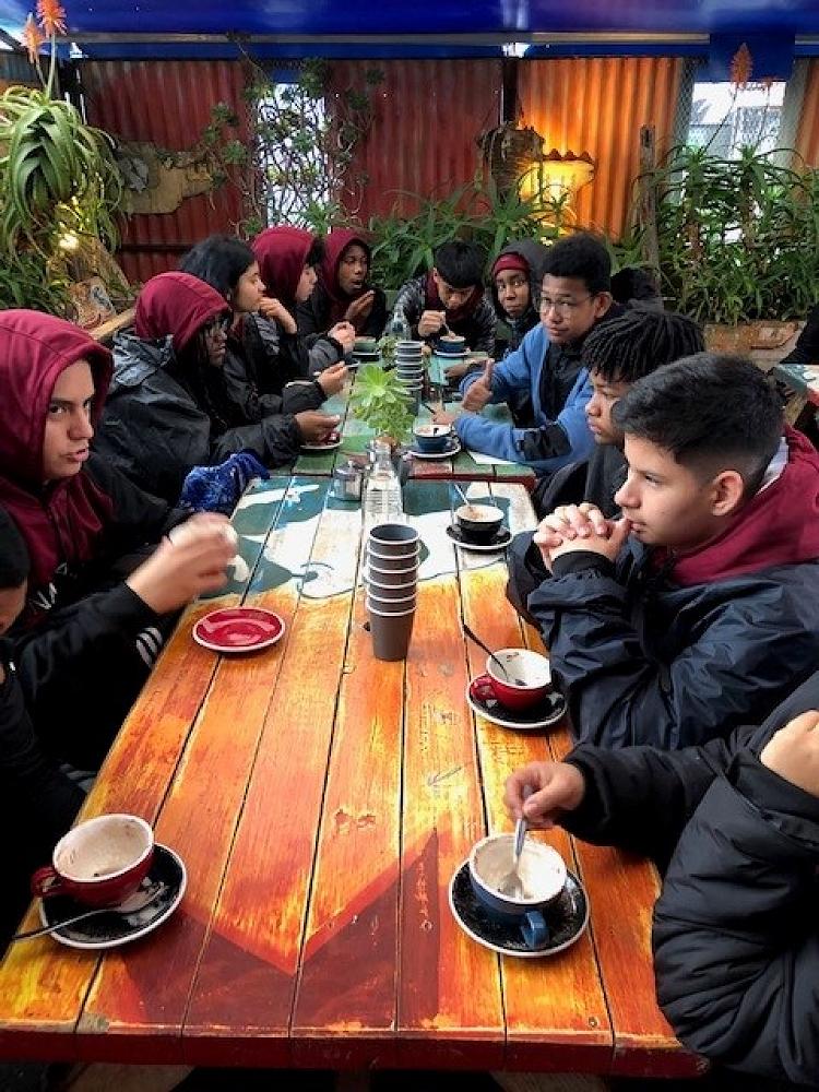 Our first stop very cold and wet was a hot chocolate at Fidel’s Café where we met an ex AFS student who attended Nayland College, she then went home for 13 years, met her partner who was from Texas and he also attended Nayland College. At the age of 29 they returned to NZ. Sofia was so pleased to see some people from her old school. Once we dried off, we then went to Te Papa.