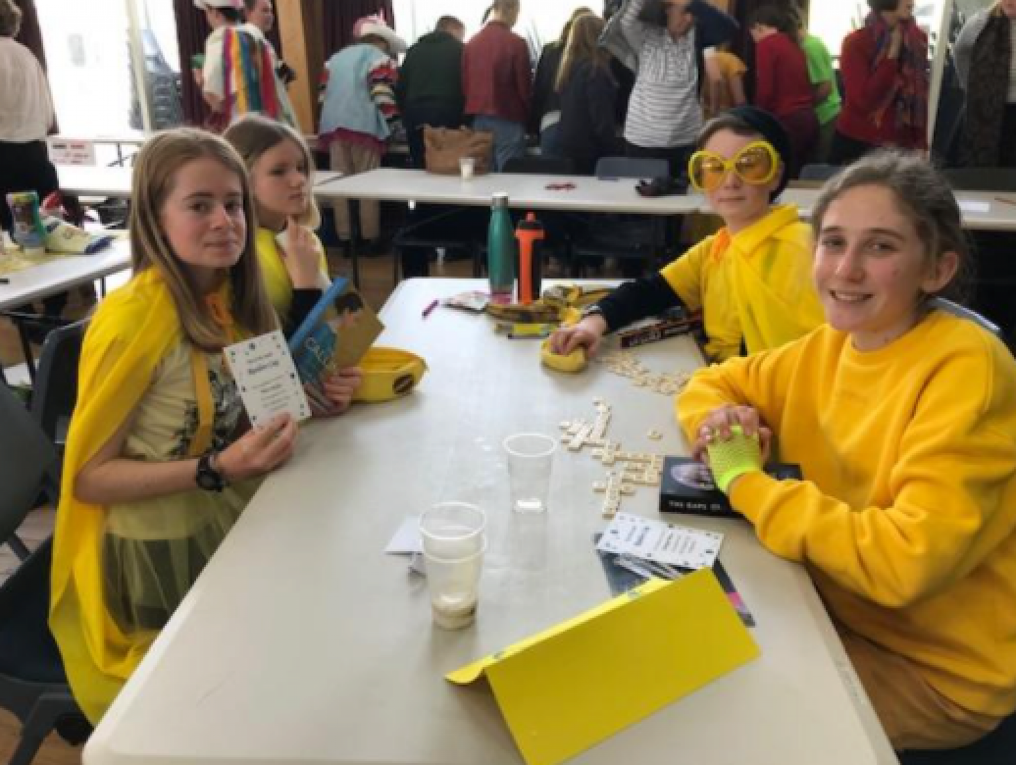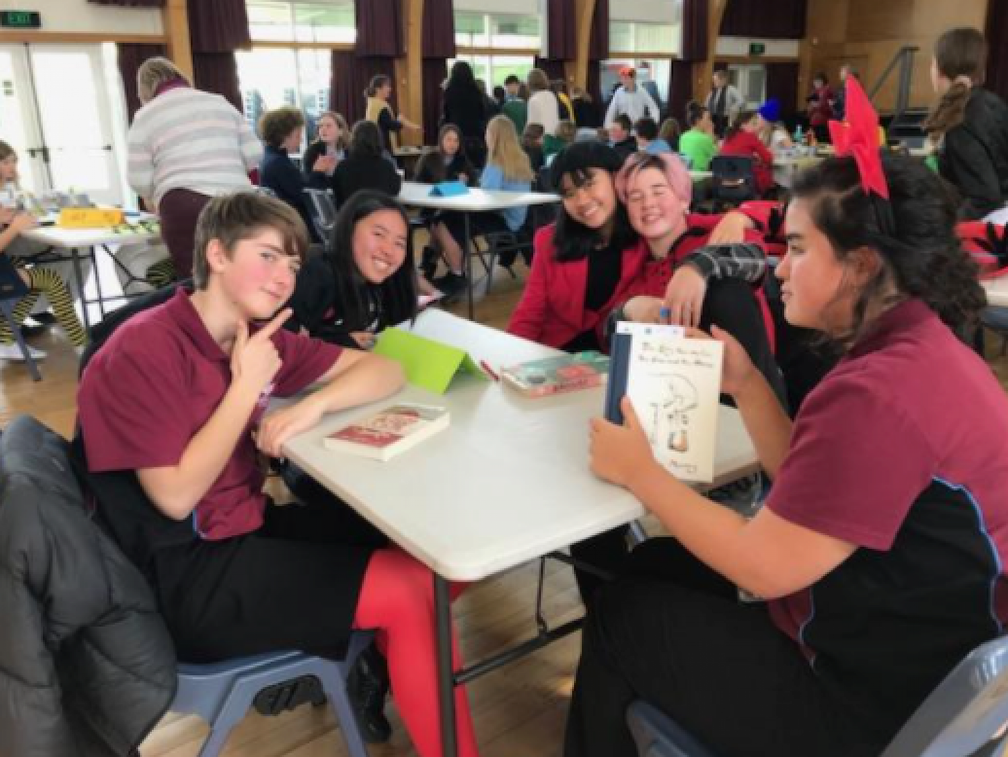 Students are encouraged to come in costume, with many choosing to coordinate their team in relation to the six books. Nayland College hosted the event in our hall, with our librarian Tracey Winslade playing a significant role in running and organizing the competition. Teams are permitted up to 5 members, but students opting to have a fifth member must have one member sit out for each round.