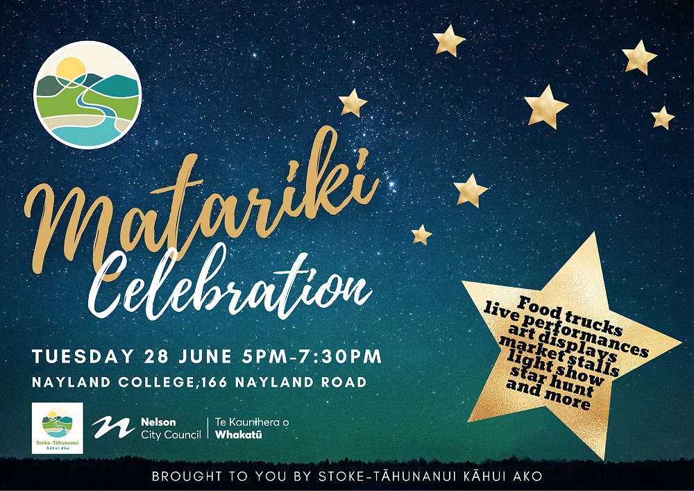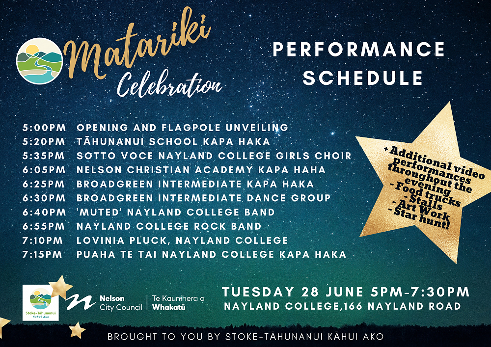 Live performances at the Stoke Tāhunanui Kāhui Ako Matariki Celebration will be going ahead tonight from 5:00pm – 7:30pm. Note there will be limited hot food options due to the weather, but there will be a free sausage sizzle! This is an informal event so please feel free to wander in and out at your own pace.