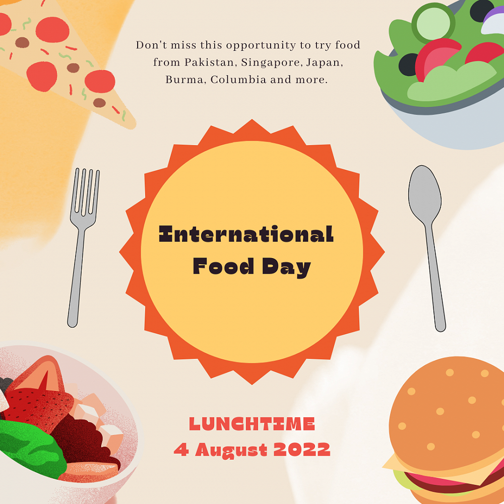 Don’t forget to bring cash for International Food Day tomorrow, Thursday 4 August. This is your opportunity to try food from Pakistan, Singapore, Japan, Burma, Columbia and more!