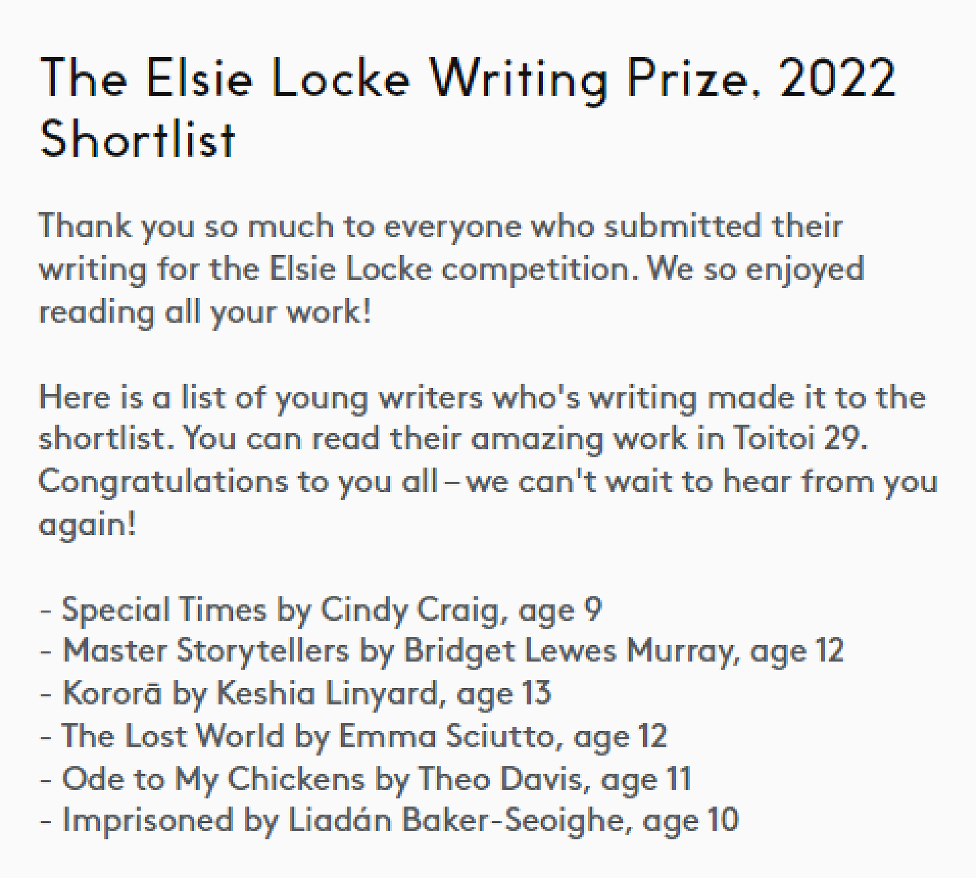 Now that Keshia is 14 years old, she is above the age limit for submitting pieces to the Toitoi journal and is on the look out for similar opportunities. However, the Toitoi editing team farewelled her with these words: