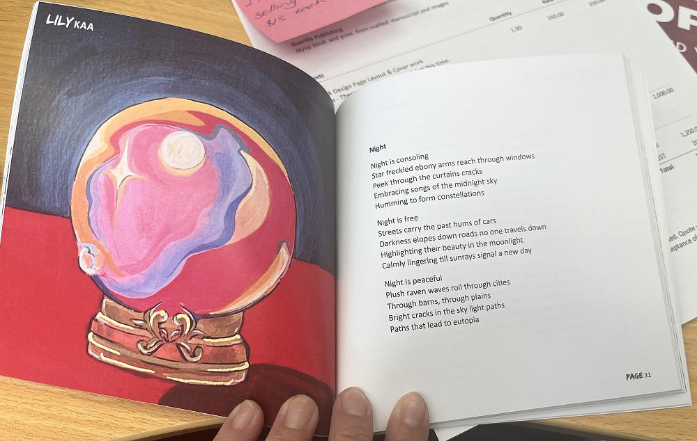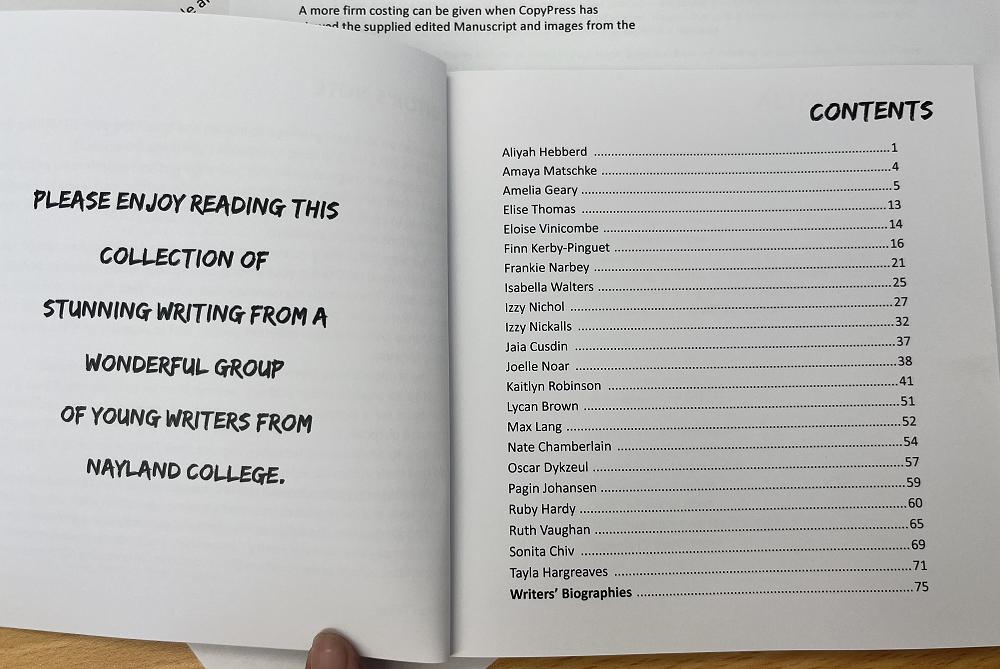 The year 10 Writing for Publication module have produced and professionally published a collection of their poetry and writing. Sample available for viewing in the Business Centre.