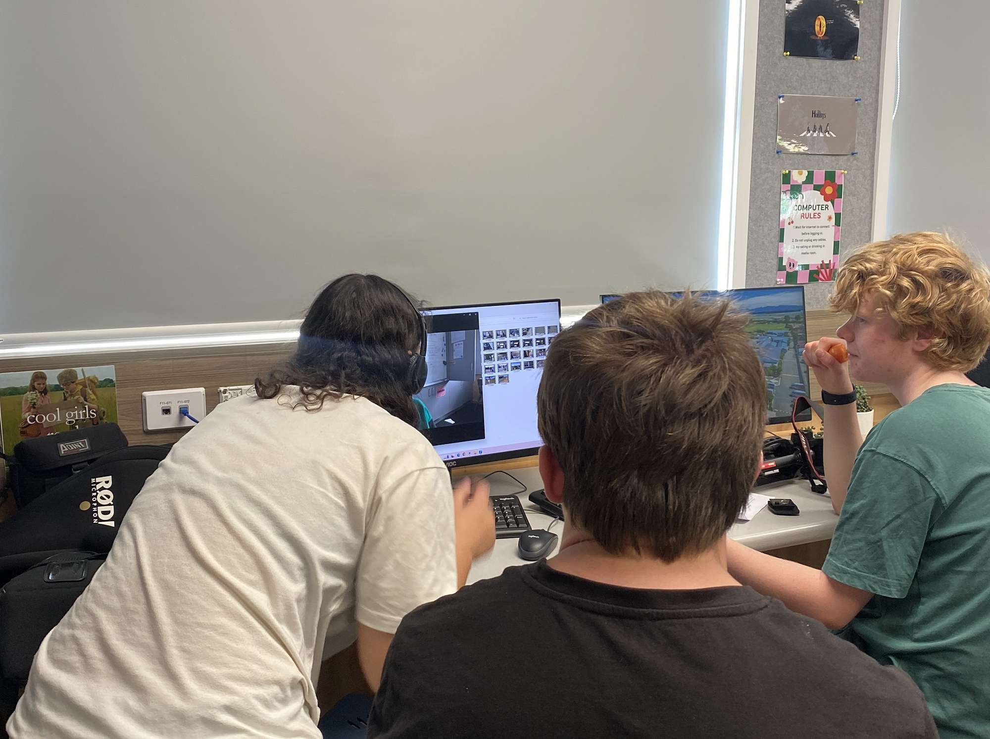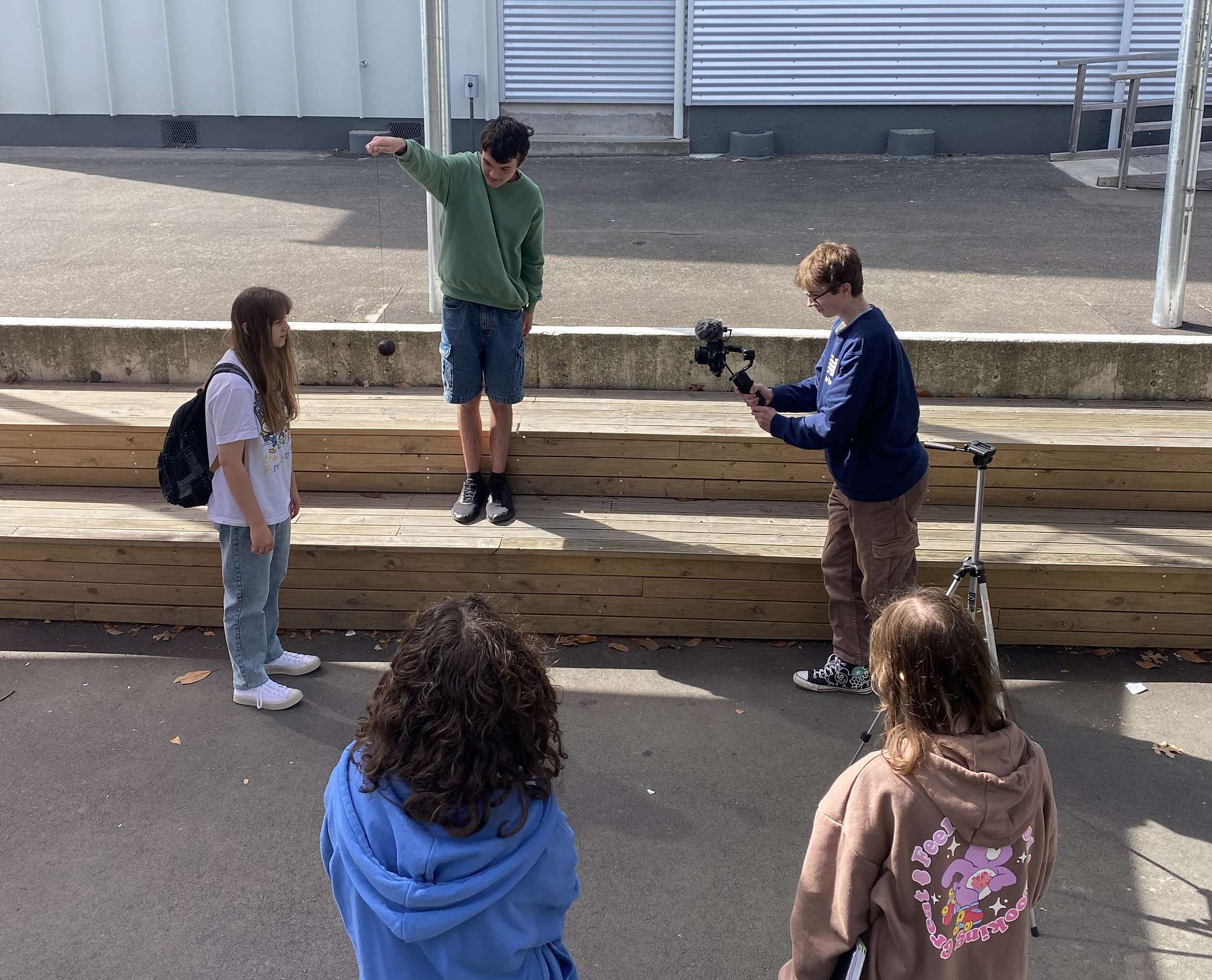 Students were organised into groups of a mix of year levels and abilities. The groups then had until 3:30pm to create a three-minute film using the prompt ‘A bad day at Nayland College’. Each group was also given a random object (such as a spatula) to include in their film.