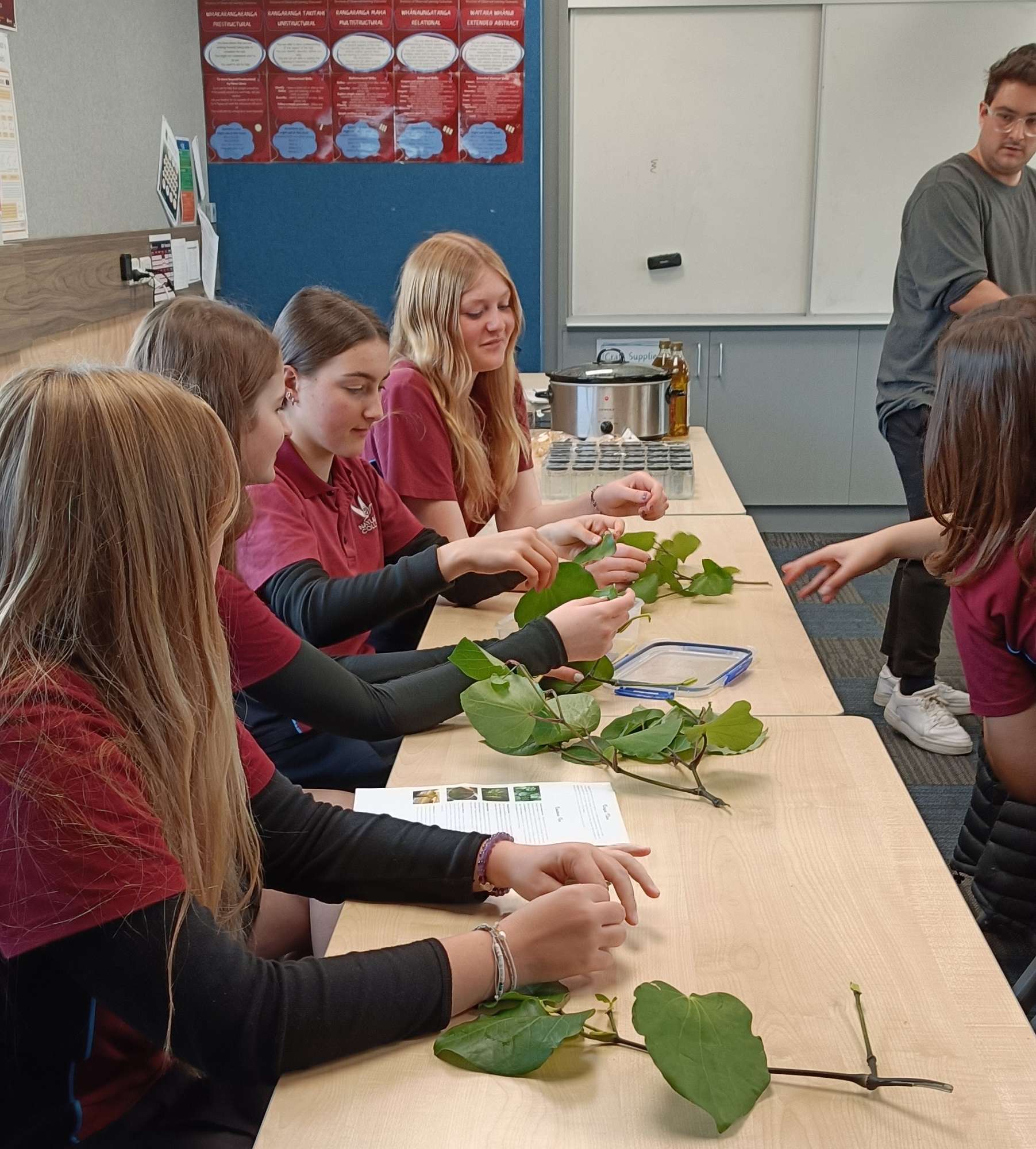The students worked in groups to pick leaves and add in olive oil. Once the fresh containers were ready for soaking, Mrs Pemberton brought out a batch that she had prepared earlier, for students to make their own kawakawa balm. The leaves had been soaking for six months and were already warmed up in a slow-cooker, ready for the addition of beeswax before spooning into jars. Each student was able to take a jar of kawakawa balm to try out at home.