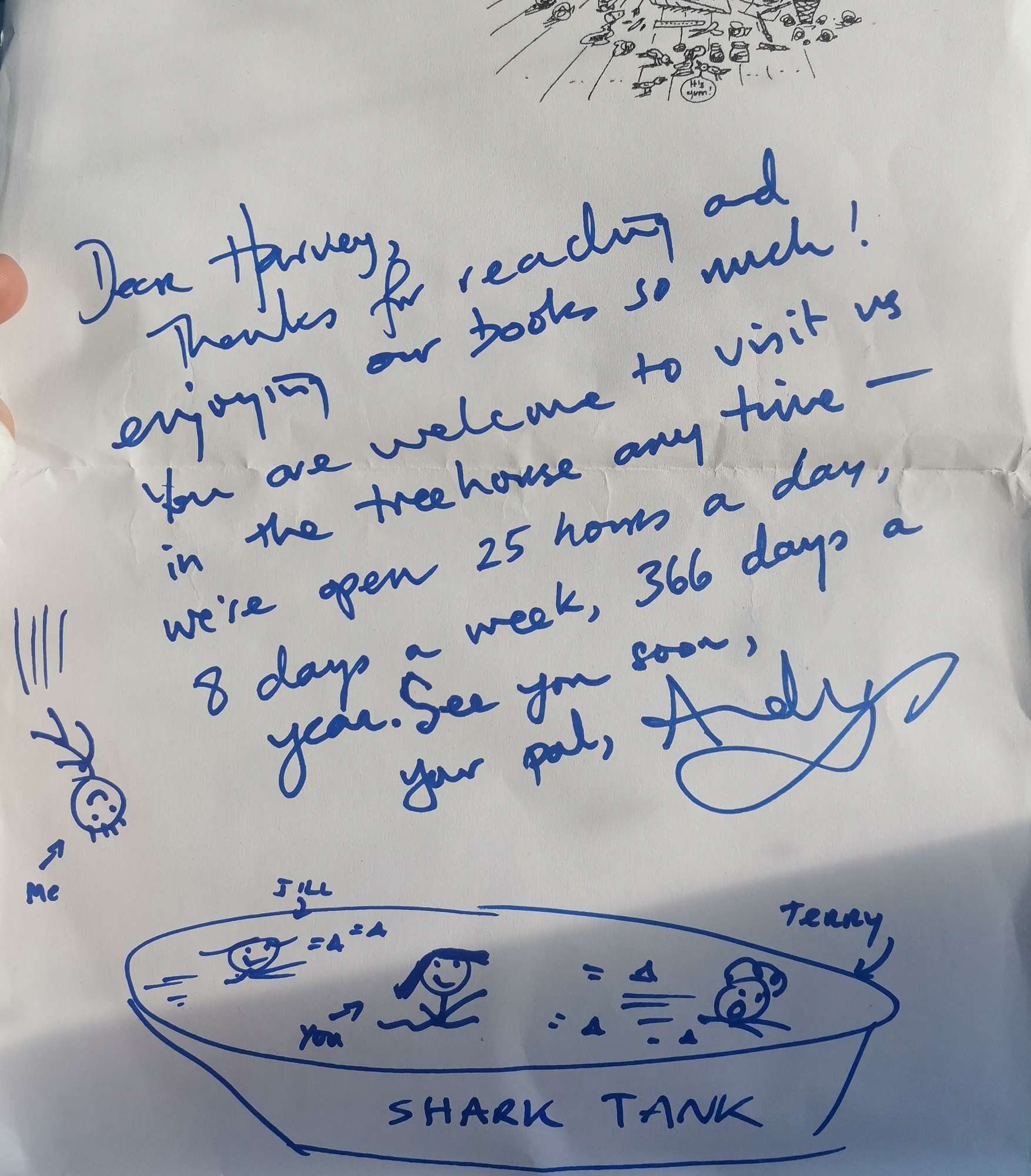 When Harvey received the parcel, there was a special surprise inside – a hand drawn illustration of Harvey added to the stories accompanied by a personal letter.